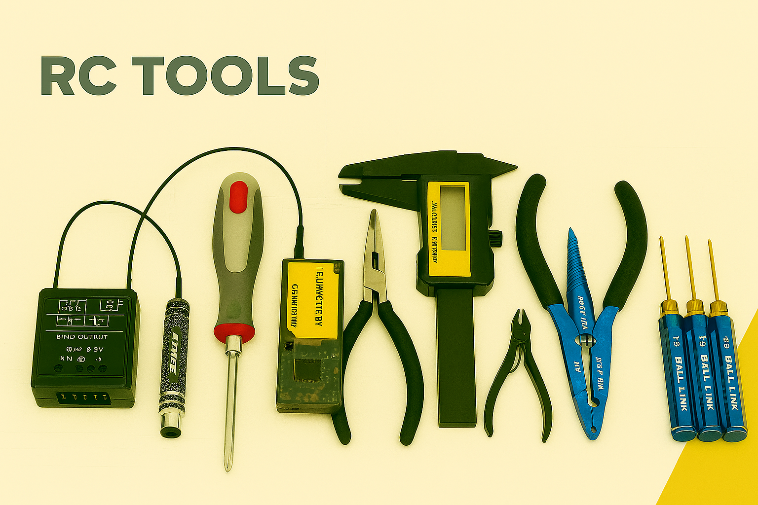 Professioneel RC gereedschap en set‑up tools: precisie schroevendraaiers, torque tools, camber‑meters, soldeer‑stations en onderhoudskits voor RC helikopters, vliegtuigen en auto's