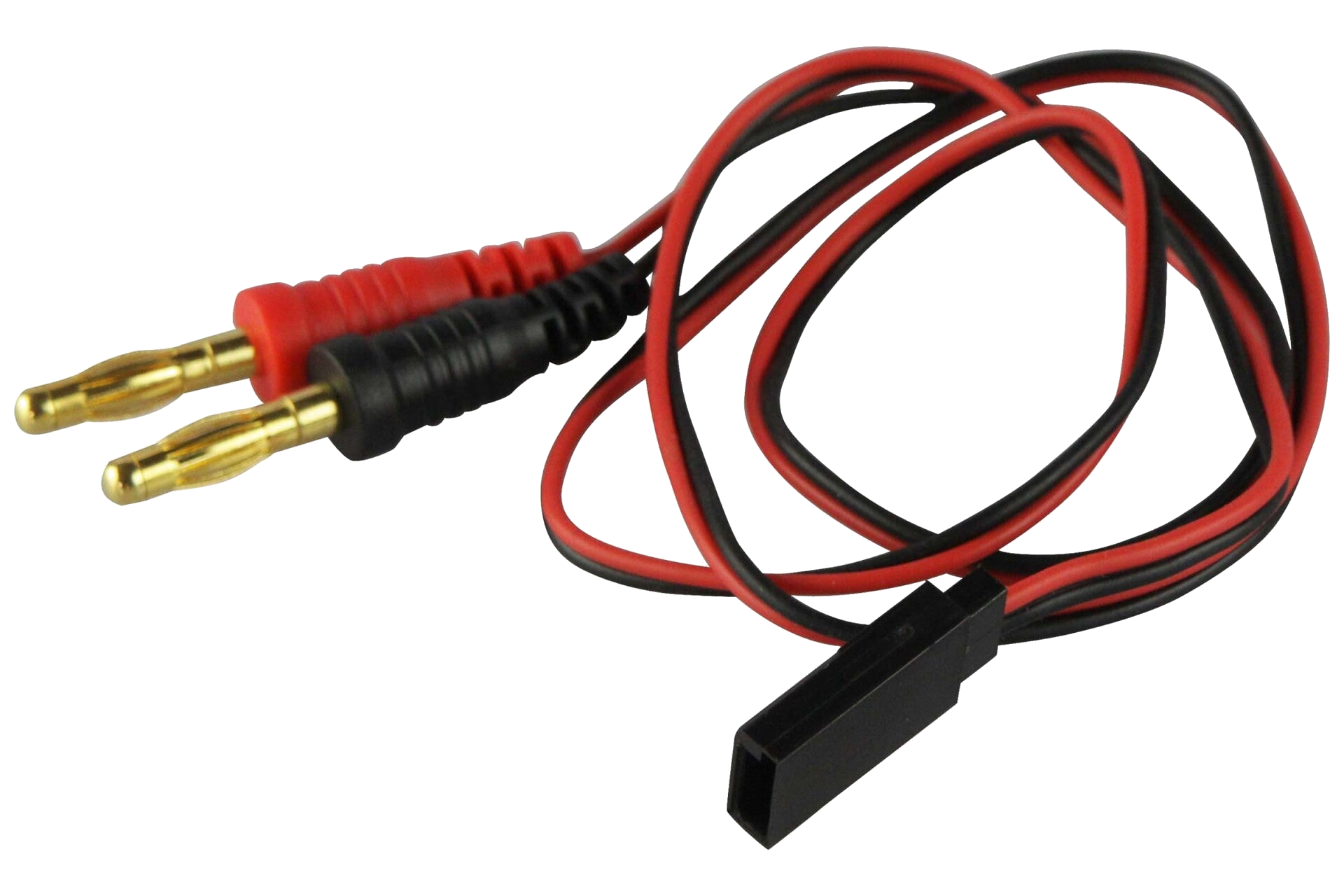 compacte laadkabel met Futaba/JR-ontvangerstekker aan de ene kant en twee 4 mm banaanstekers aan de andere kant, 30 cm lengte, AWG20 siliconenflexibel. Ideaal voor veilig en comfortabel opladen van Futaba-zenders en ontvangers met externe laadpoort.